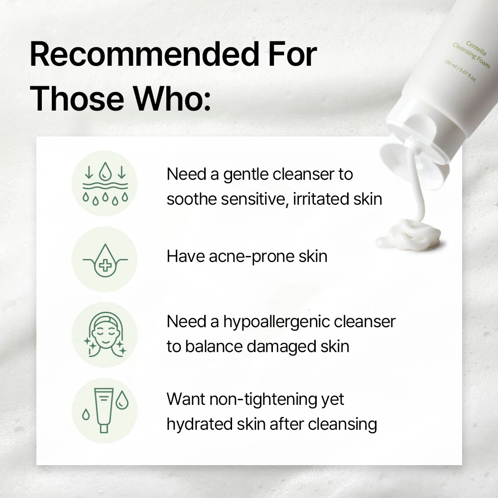 mixsoon’s Centella Cleansing Foam is a gentle yet effective cleanser that refreshes and soothes your skin with the calming power of Centella Asiatica. Infused with natural ingredients, it deeply removes impurities, excess oil, and makeup without stripping your skin, leaving it soft, hydrated, and balanced. This cleansing foam is formulated to be gentle on the skin, making it ideal for all skin types, especially sensitive skin. The key ingredient, Centella Asiatica, is known for its soothing and healing properties, which help calm redness, irritation, and inflammation, ensuring a thorough cleanse without the harsh effects typically associated with other cleansers.